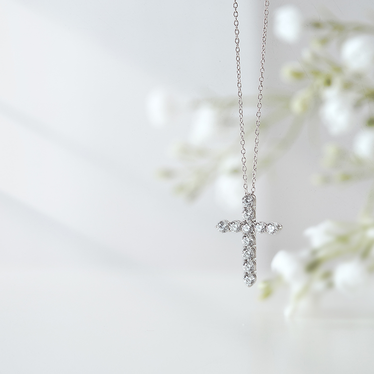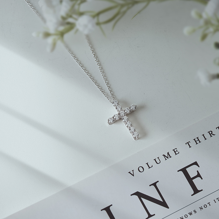 다이아몬드로 장식한 십자가 목걸이는